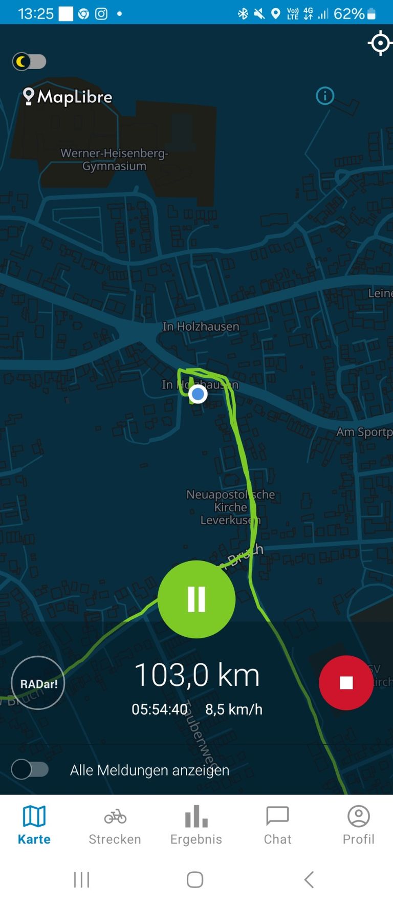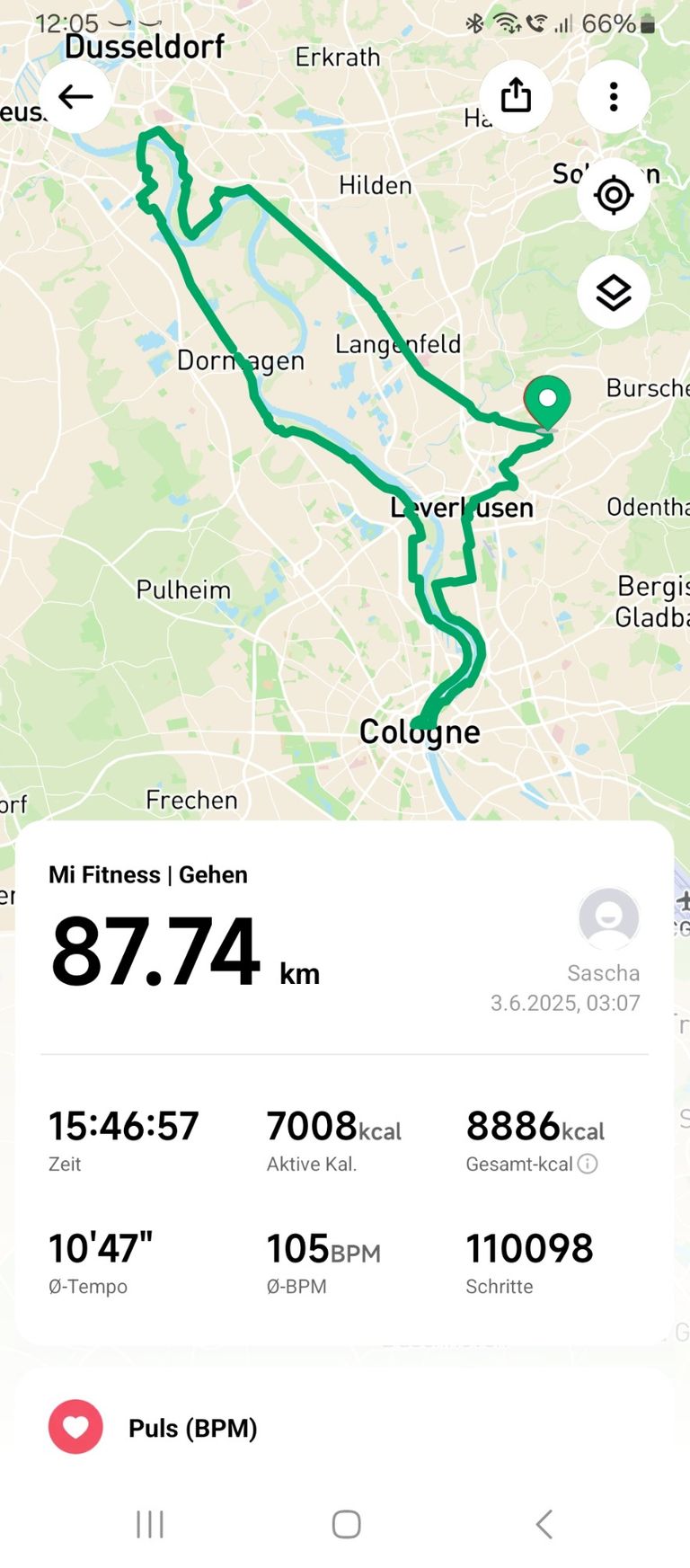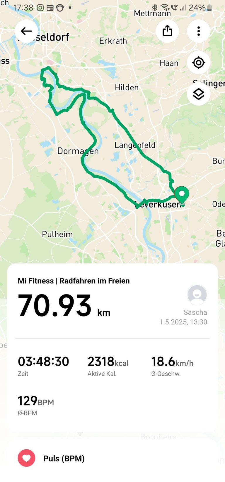 It´s 01:40 in the afternoon and I´ve made 27655 steps for 27.47K and burned 3198 active kcal in 315 minutes. And the explenation for that is, that I had a flat tire in Burscheid, had to walk back and then I had to walk to a store where I could by some tires for my bike. So I had to walk more could bike less than planned today.