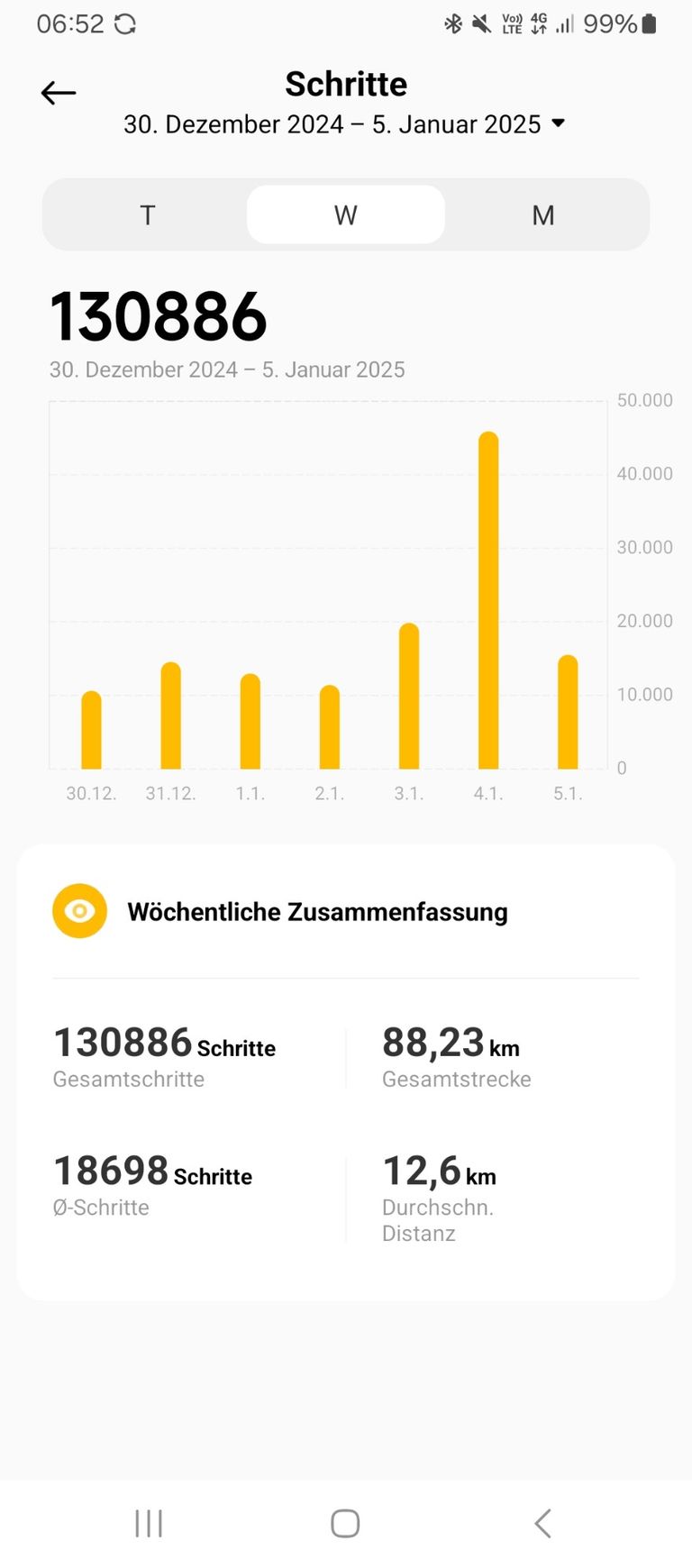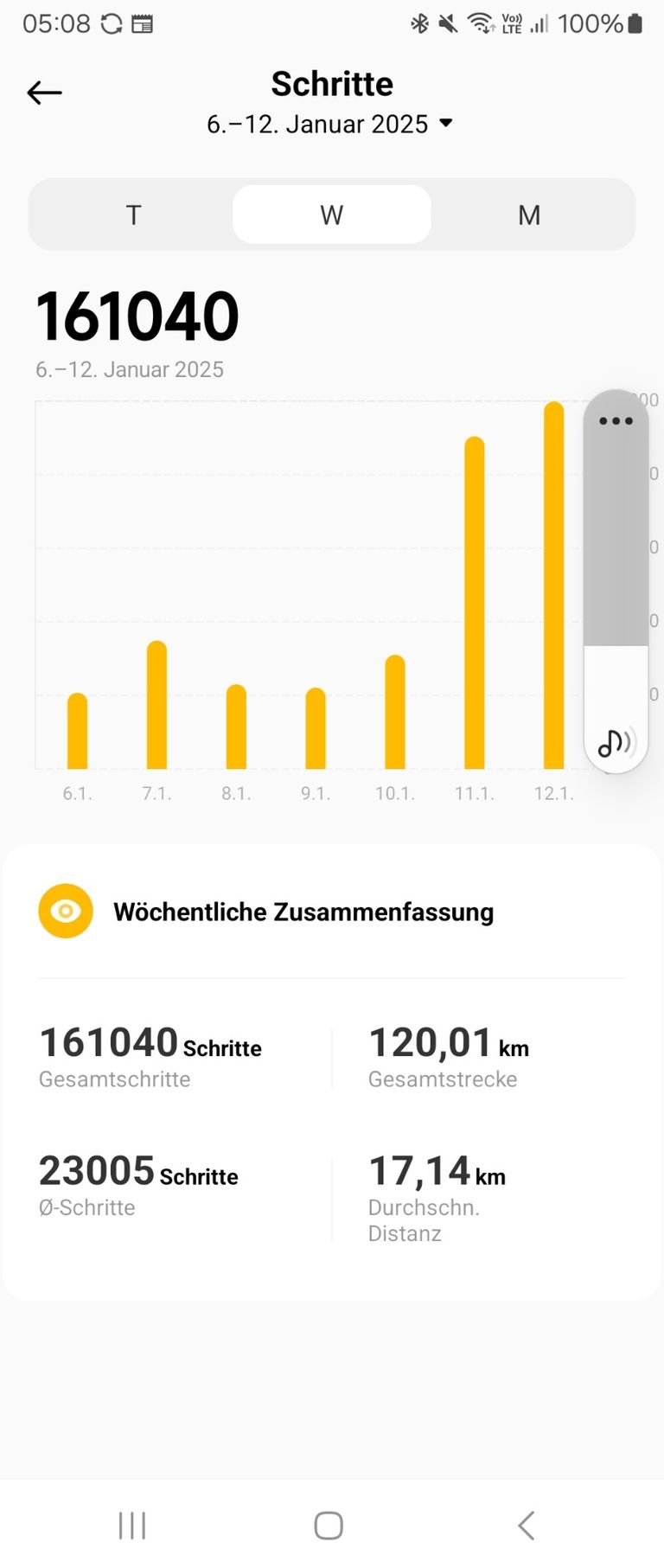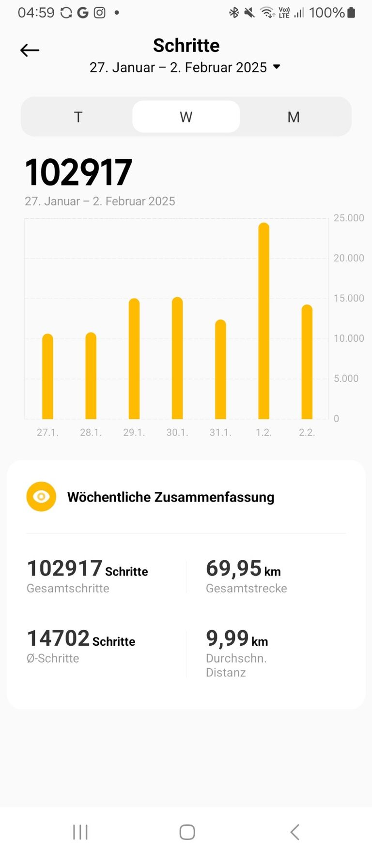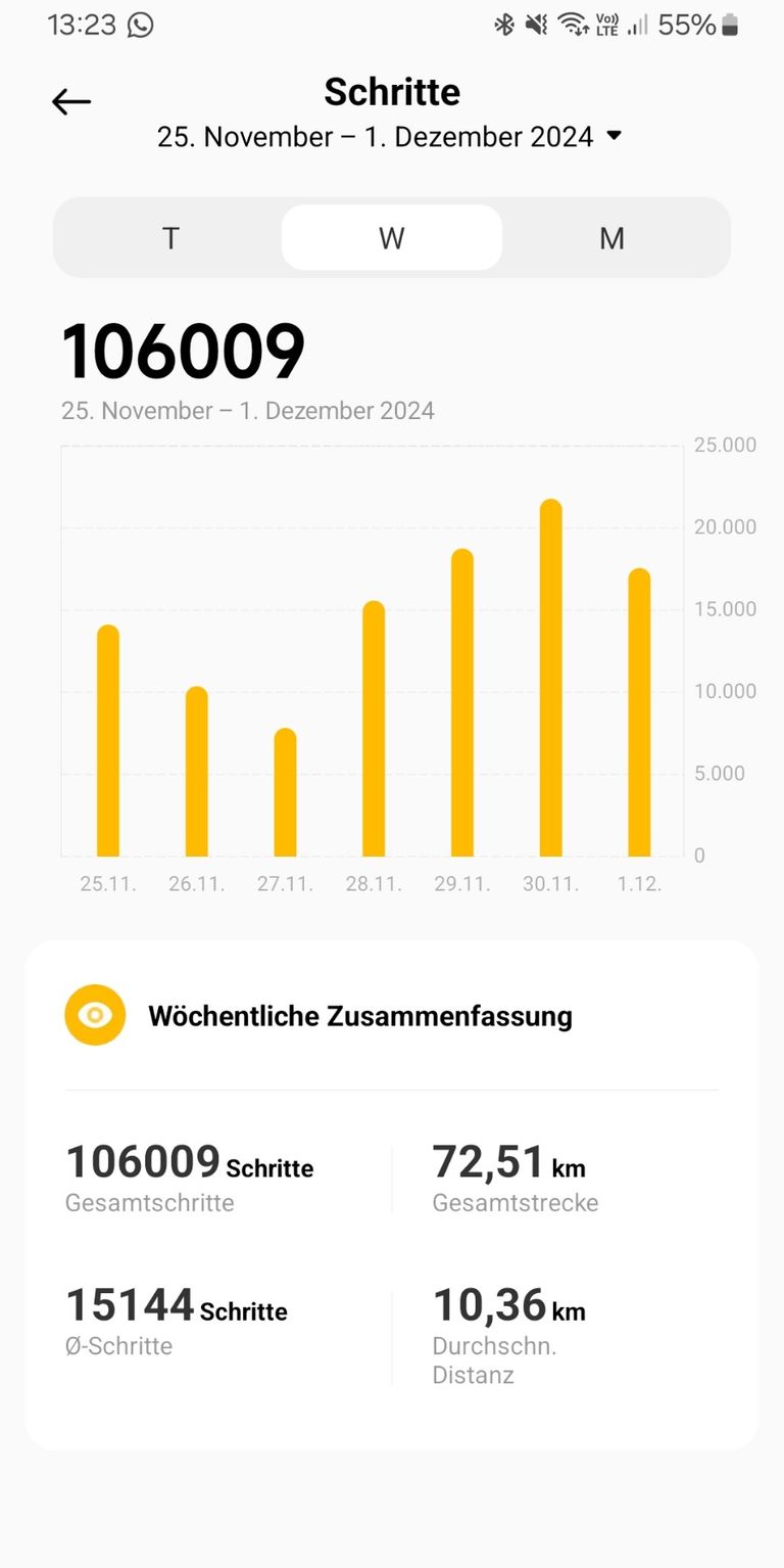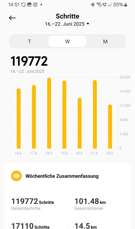 In this week I haven´t manage to throttle my sporting activities enough. I cracked my 100 k goal. I also reached the minimal goal of doing 10.000 steps per day, by reaching the double amount in average.