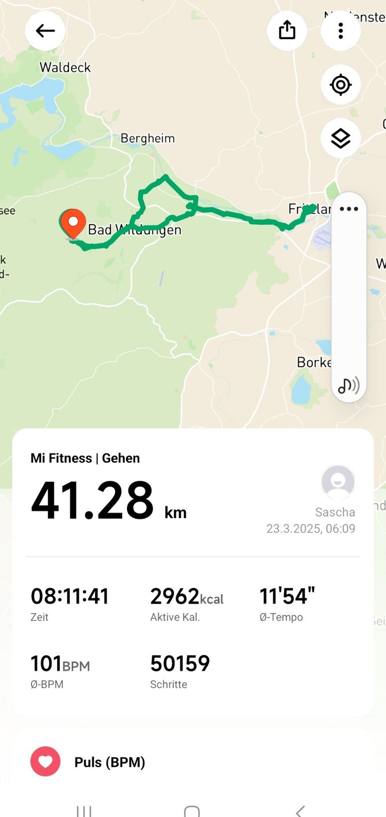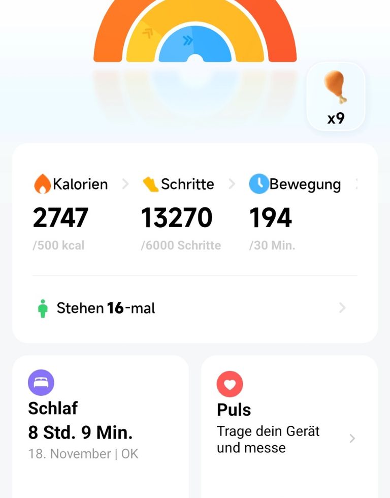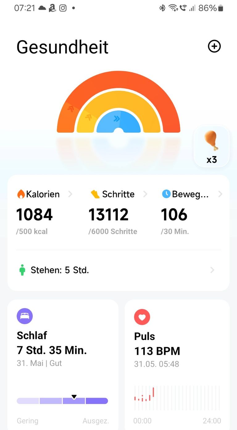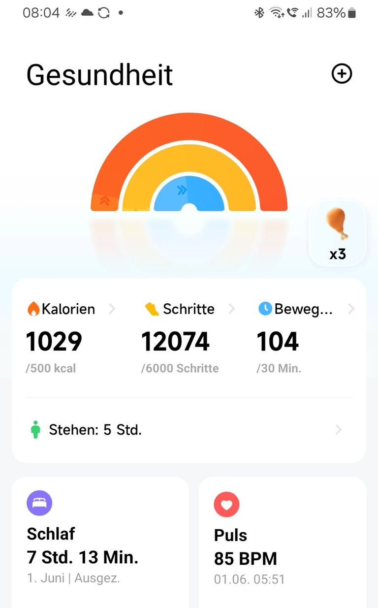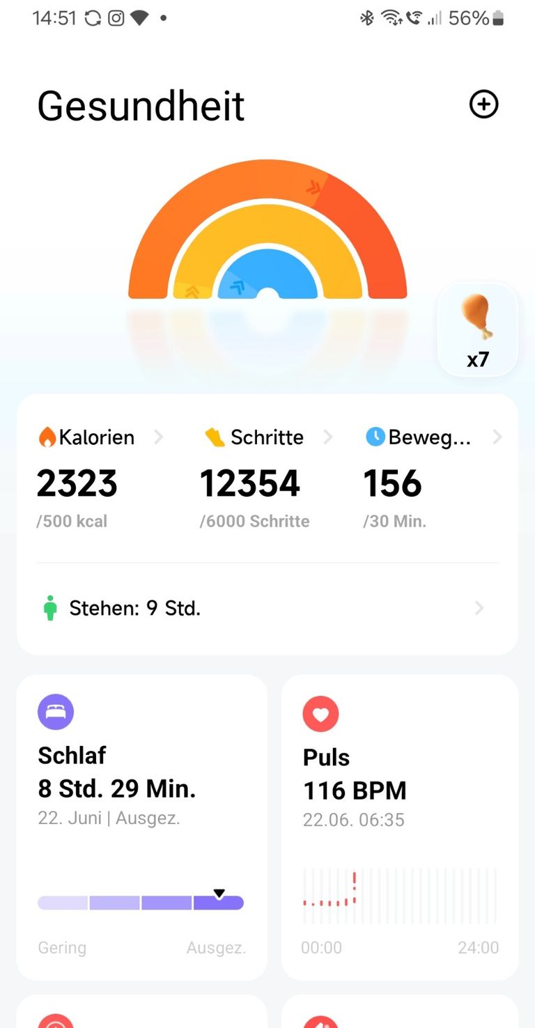 It´s 12.50 in the afternoon. The goals of the day are reached: 13551 steps for 11,84 Kilometers and 1832 kcal burned in 160 Minutes.