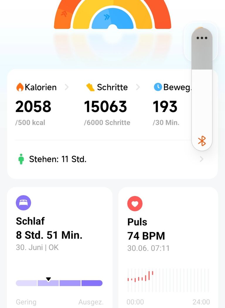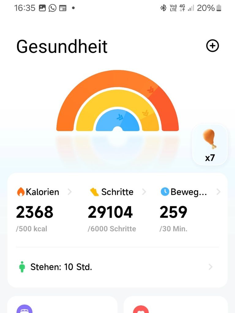 It´s 7.28 in the evening and the goals of the day are reached: 14256 steps, 12,93 K, 2390 active kcal, 188 minutes.